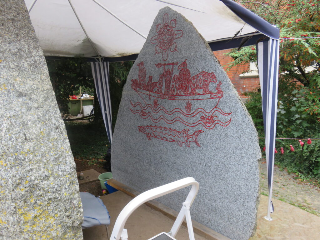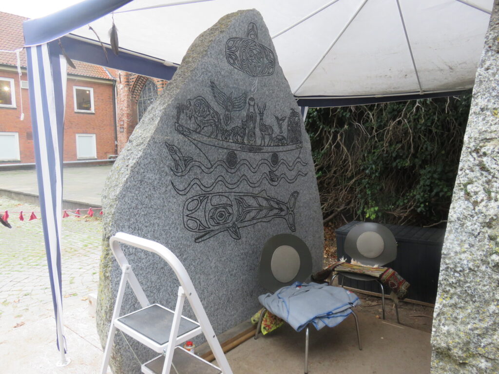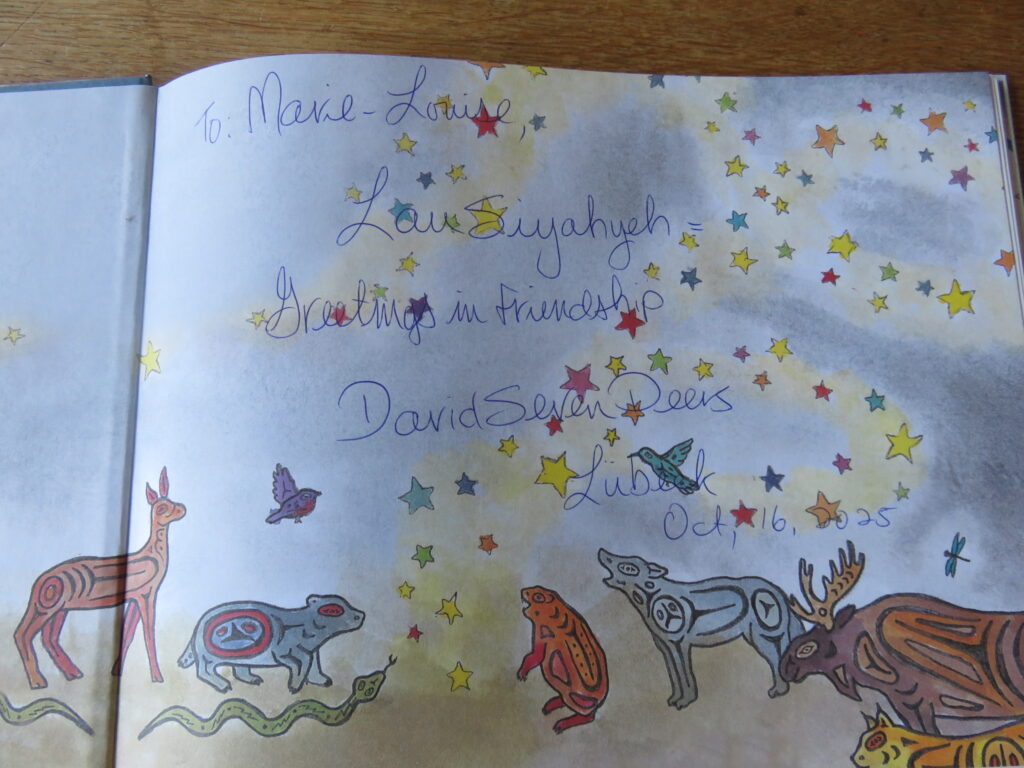Am Donnerstag fuhr ich ein zweites Mal nach Lübeck, um an David Seven Deers Feuer im Innenhof des Doms zu sitzen. Ich war früh da und kaufte im Museumsshop eins der Bücher von David: Heelahs Traum. Es ist ein Buch für Kinder, aber wie wohl die meisten Kinderbücher auch für Erwachsene geeignet. Mit dem Buch in der Hand ging ich zu dem Platz, wo David seit einem halben Jahr an seinem Spirit Canoe arbeitet. „You want me to sign the book?“ fragte er und schrieb mir dann eine Widmung hinein, in der Sprache seines Volkes und auf Englisch. Er sprach die indianischen Worte laut aus und ließ sie mich wiederholen. Später, als ich einen Kaffee im Café im Innenhof trank, kam er zu mir und lud mich ein zum Feuer zu kommen, das er gerade angezündet hatte. Nach und nach kamen Menschen, viel mehr als bei meinem letzten Besuch. Ich kam mit den beiden Frauen ins Gespräch, die neben mir auf der Bank saßen. Beide waren regelmäßig hierher gekommen und sprachen mit großer Achtung über David Seven Deers. Eine von ihnen sagte: „Es ist ein Geschenk, was er hier macht.“ Da konnte ich ihr aus vollem Herzen zustimmen.